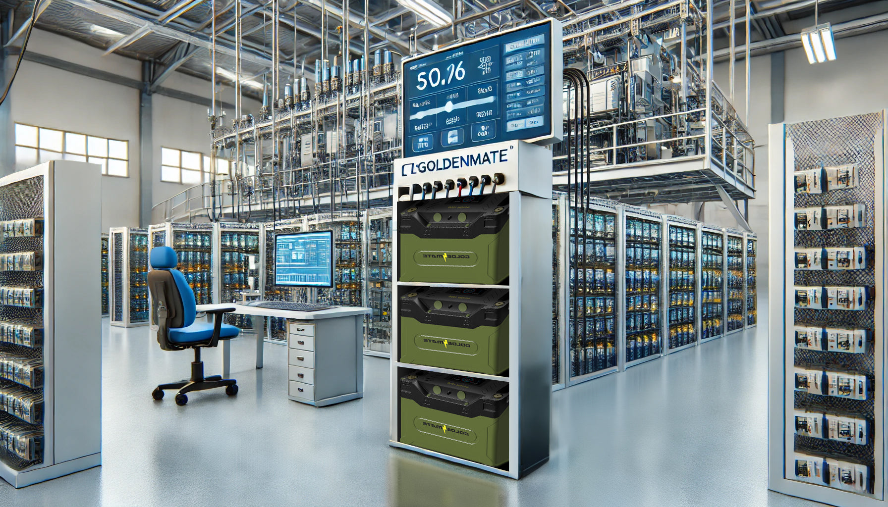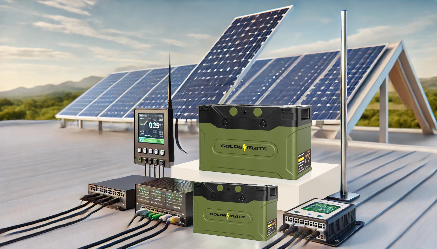- In solar power systems, GoldenMate Orion1000 batteries connect to solar charge controllers or energy management systems via the RS485 interface.