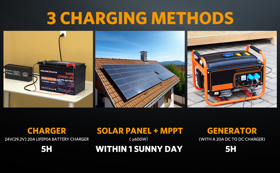 GoldenMate LiFePO4 batteries can be charged in several ways: