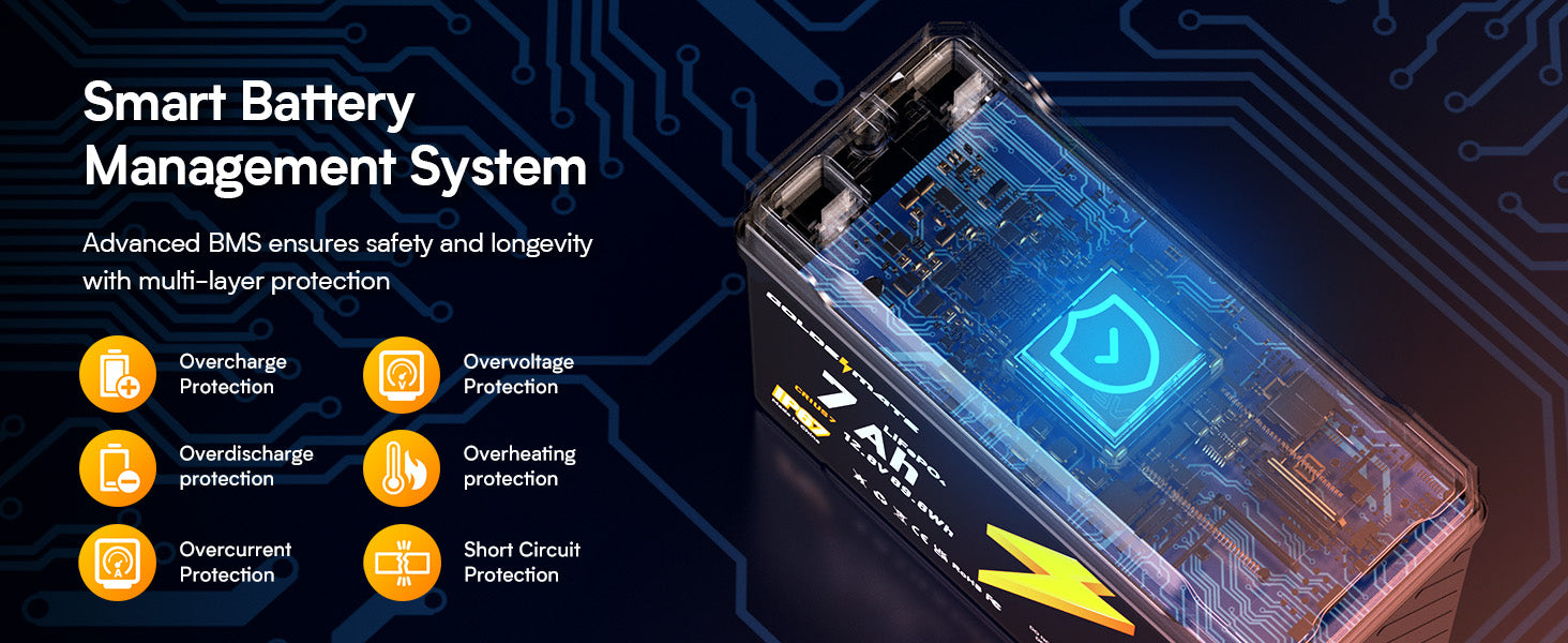 - Superior Performance: GoldenMate 12V 10Ah LiFePO4 Battery is a perfect replacement for traditional lead-acid batteries since LiFePO4 battery offers high energy density, long cycle life, and excellent safety features. The built-in 10A battery management system (BMS) to protect batteries from overcharge, over-discharge, over-current, over temperature, and short circuit. Its low self-discharge rate ensures hassle-free storage for up to 1 year.