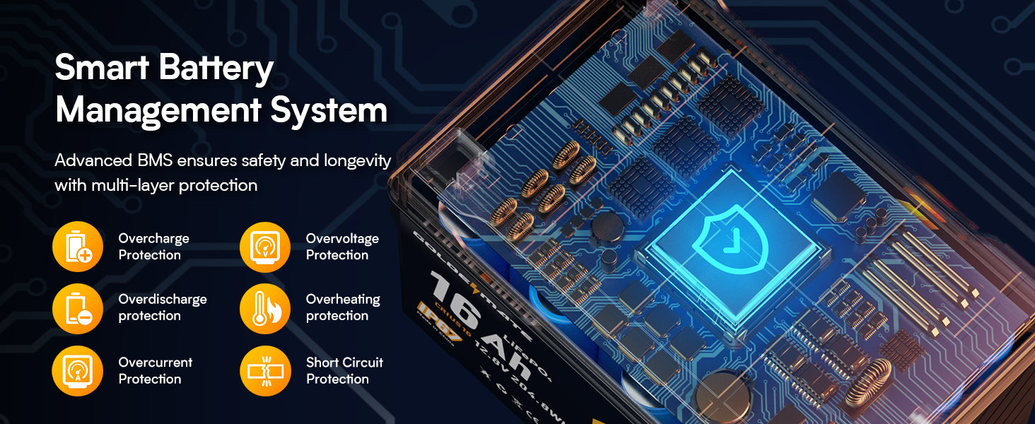 Ideal for off-grid power, small EVs, boats, RVs, and camping. Features built-in BMS with multiple safety measures for reliable performance.