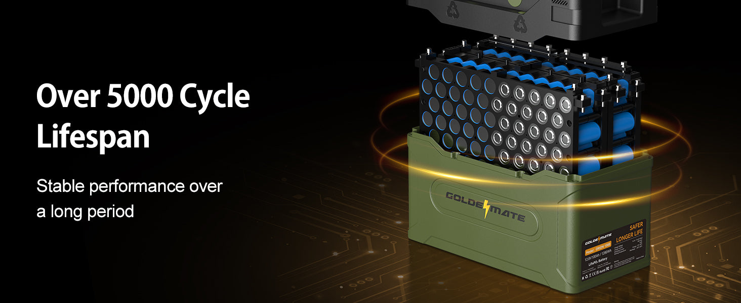 - 5000+ Cycles & 10 Years Lifetime: GoldenMate 100Ah lithium batteries have a low self-discharge rate and support 100% DOD and 100% SOC, providing better performance and longer battery life. Goldenmate 12V 100Ah lithium battery can run 5000+ cycles, its lifetime can last up to 10 years.