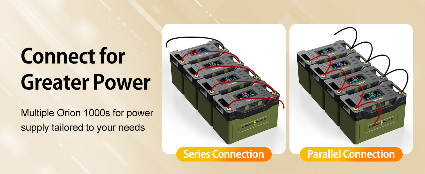 - Capacity Expansion: GoldenMate 12V 100Ah LiFePO4 battery can be connected in parallel & in series for larger capacity. Allow being extended up to 4S or 4P to get Max 400Ah capacity or Max 51.2V voltage.