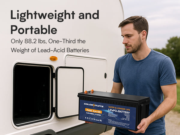 - 1/3* Lightweight: GoldenMate 12V 200Ah LiFePO4 Battery weighs only 48.28 lbs, compared to lead-acid batteries, lithium battery provides 56Wh/lb energy density, and only 1/3* the weight of the lead-acid battery, which makes it easier to install or move. It is a perfect upgrade for any 12V Deep Cycle battery. This makes Lithium batteries perfect for solar homes, RVs, campers, motor homes, and off-grid applications.