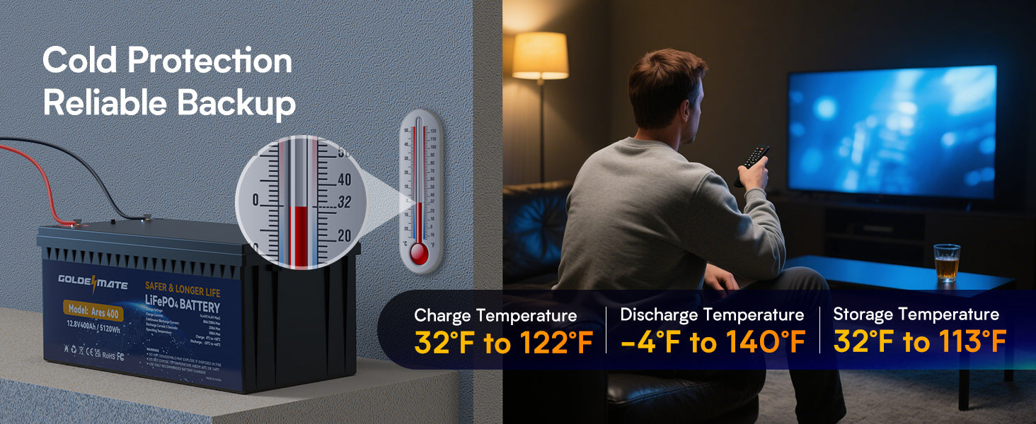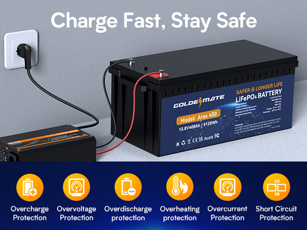 - 100% Protection: GoldenMate LiFePO4 batteries has built-in BMS (Battery Management System) to protect it from overcharge, over-discharge, over-current, and short circuits with ultra-low self-discharge rate. Built-in high-temp cut-off prevents charging over 167 °F (75 °C). Without memory effect, no matter what state the battery is, it can be used as soon as it is charged.